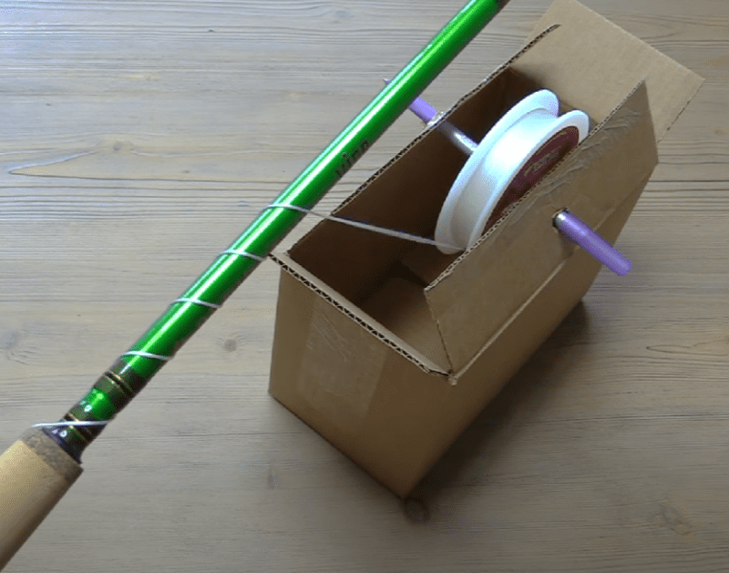 Attach the spool to the reel. Take your box and Bic pen, poke holes in each flap of the box, and slide the spool through the holes. This setup allows the spool to spin freely on the pen. Now, attach your reel to the rod.